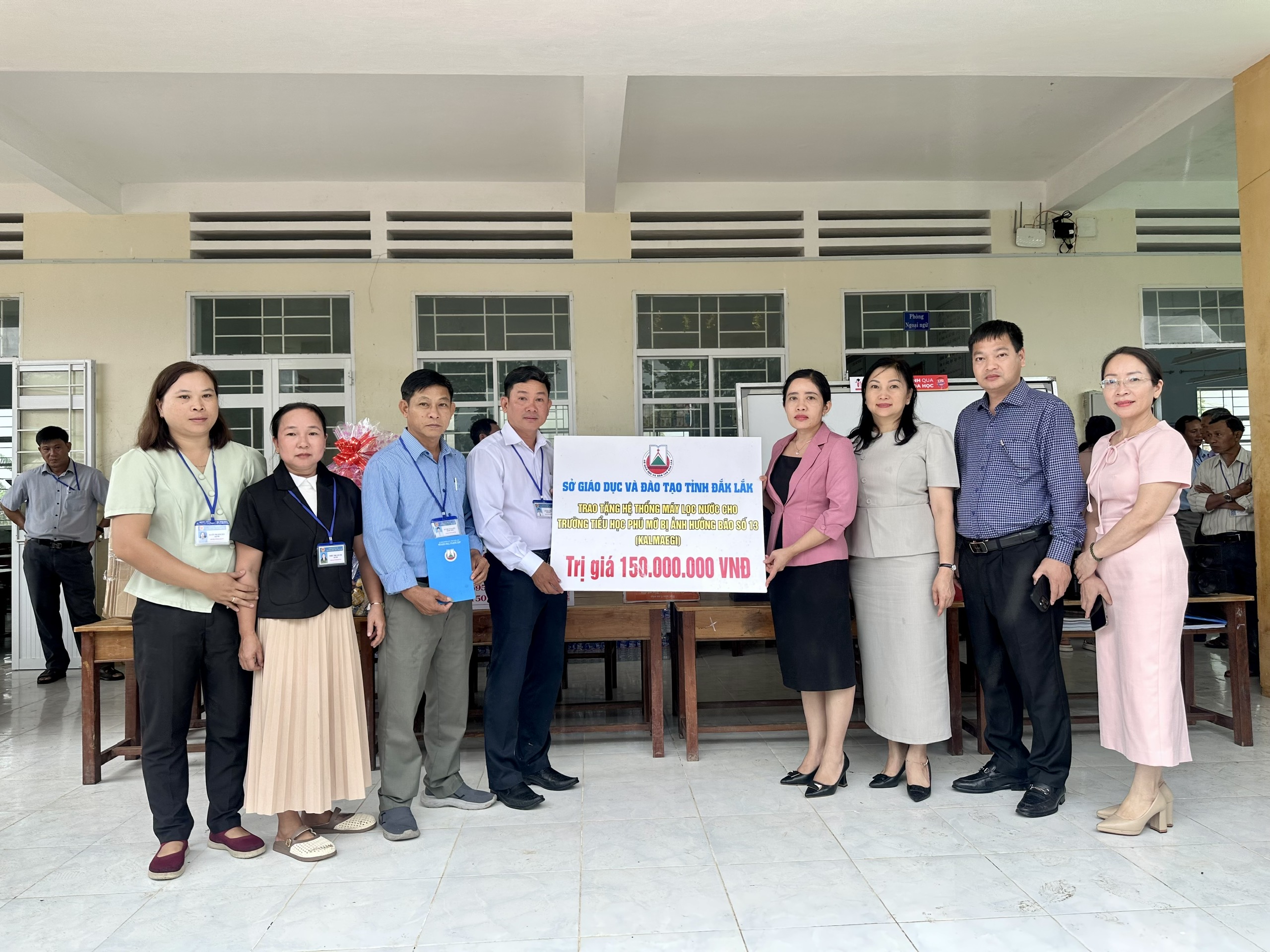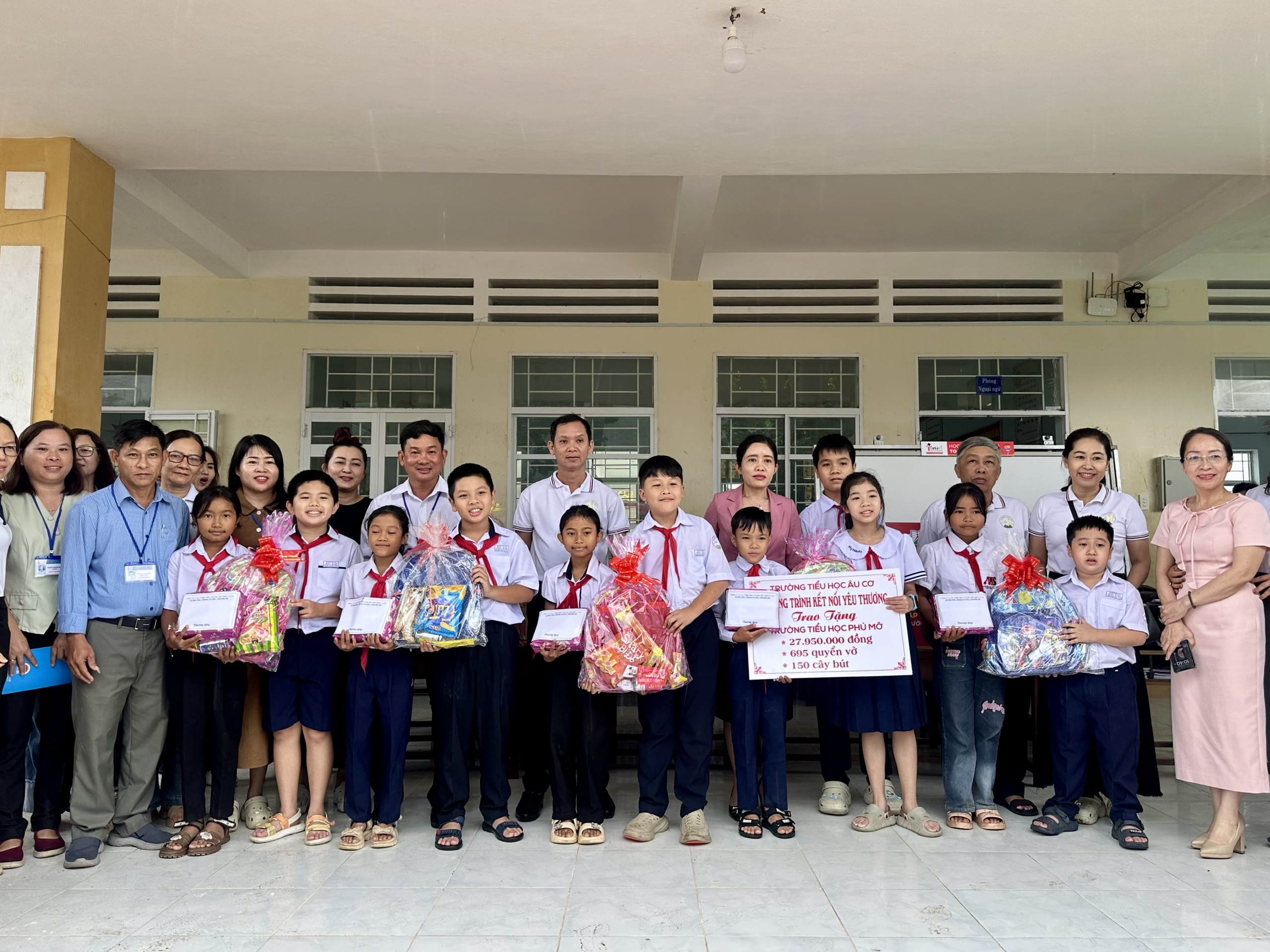 Lãnh đạo Sở GDĐT và nhà tài trợ tặng quà cho trường TH Phú Mỡ