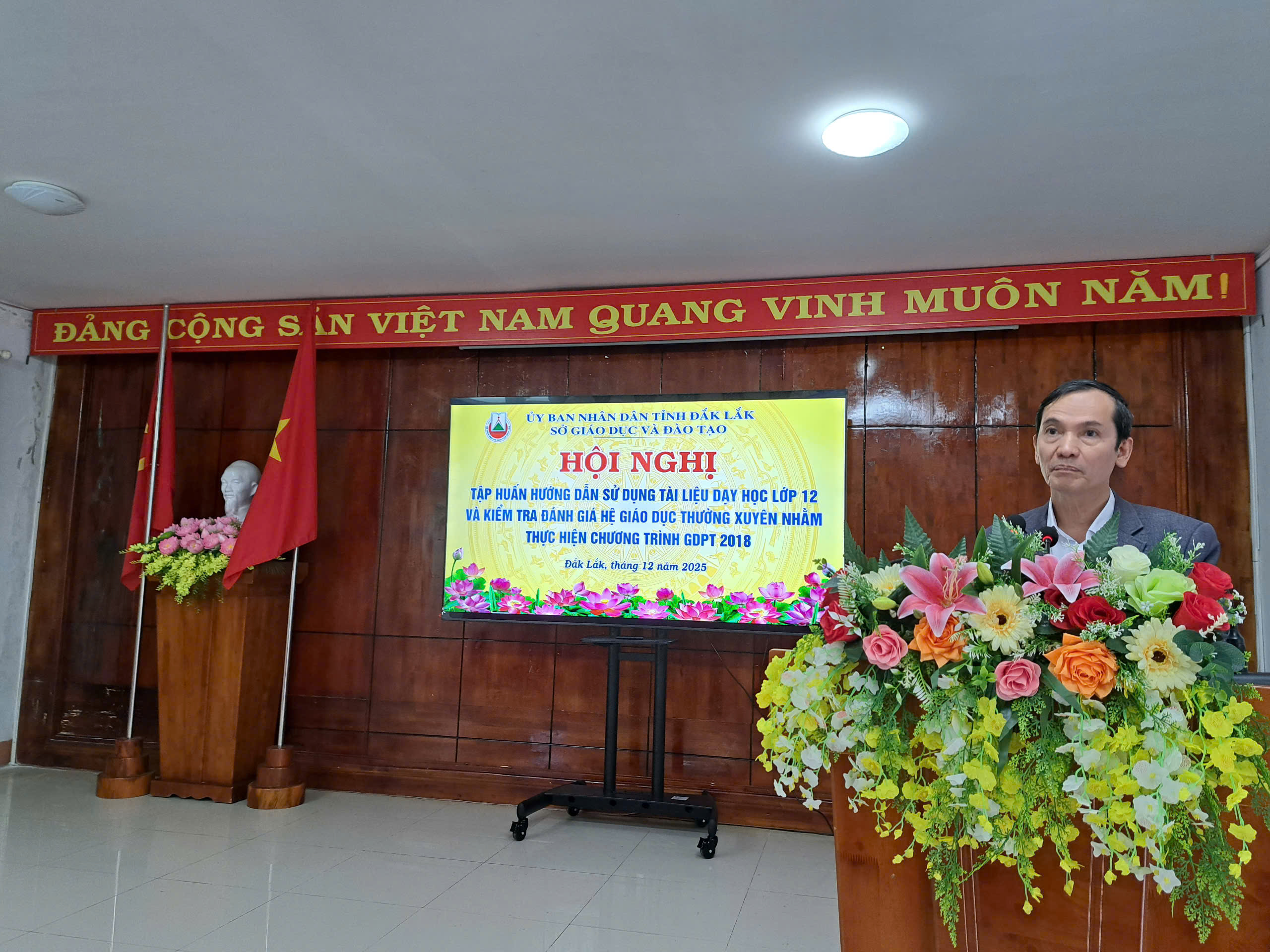 Sáng ngày 11/12/2025 tại Trung tâm Giáo dục thường xuyên tỉnh, Sở Giáo dục và Đào tạo (GDĐT) Đắk Lắk đã tổ chức Hội nghị tập huấn hướng dẫn sử dụng tài liệu dạy học lớp 12 và kiểm tra đánh giá hệ Giáo dục thường xuyên (GDTX) nhằm thực hiện Chương trình GDPT 2018. Hội nghị diễn ra trong 02 ngày, từ ngày 11/12 đến ngày 12/12/2025 với sự tham gia của gần 200 cán bộ quản lý và giáo viên các bộ môn: Toán, Ngữ văn, Vật lí, Hóa học, Sinh học, Lịch sử, Địa lí, Tiếng Anh, Tin học, Giáo dục kinh tế và pháp luật, Công nghệ của các đơn vị Trung tâm Giáo dục thường xuyên tỉnh, Trung tâm GDNN-GDTX và các Trường Trung cấp, Cao đẳng (có dạy chương trình GDTX cấp THPT) trên địa bàn tỉnh.