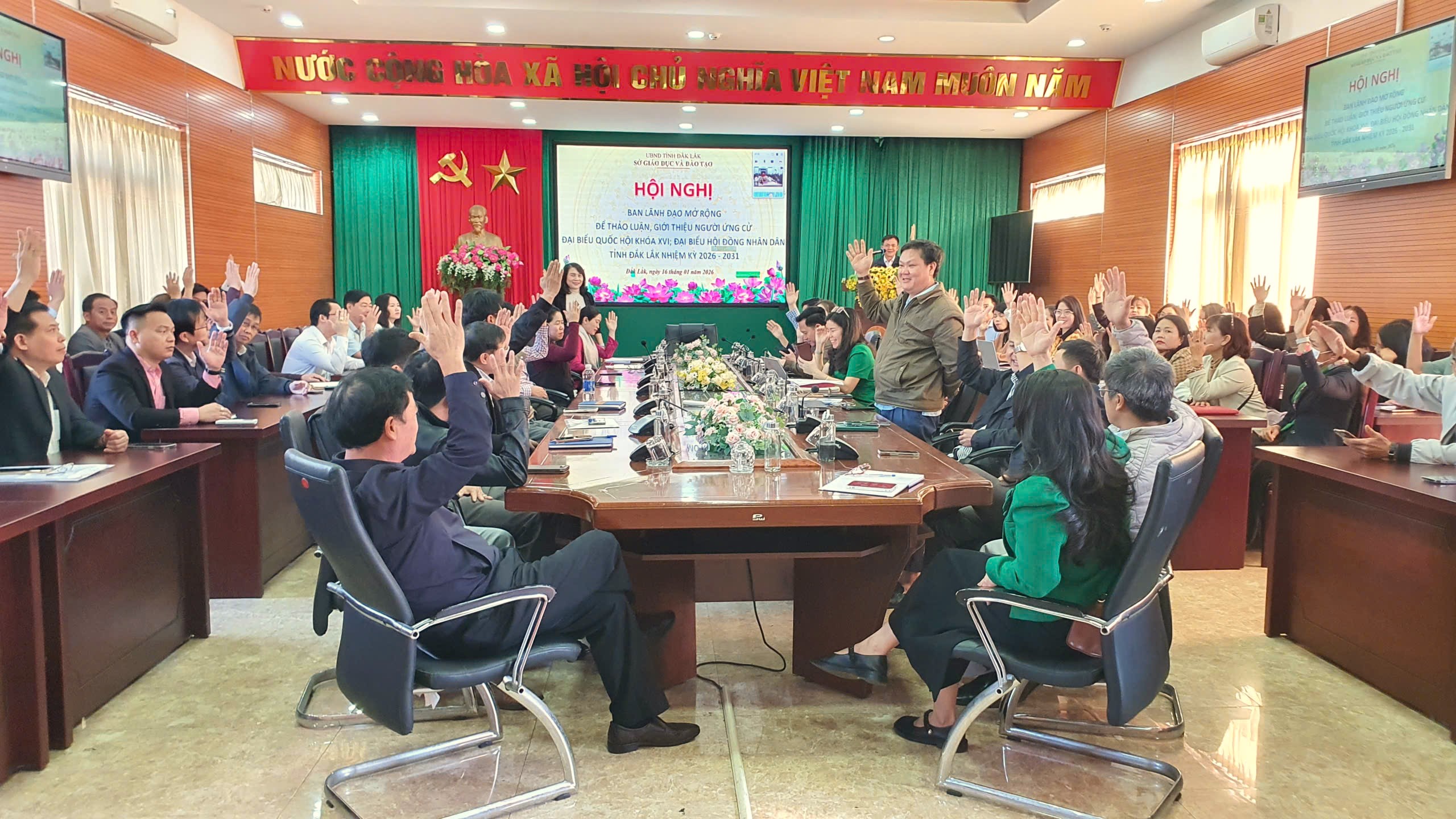 Thực hiện Luật Bầu cử đại biểu Quốc hội và đại biểu Hội đồng nhân dân; căn cứ các nghị quyết, hướng dẫn của Ủy ban Thường vụ Quốc hội, Hội đồng bầu cử quốc gia và Ủy ban Mặt trận Tổ quốc Việt Nam; trong hai ngày 15 – 16/01/2026, Sở Giáo dục và Đào tạo tổ chức Hội nghị lấy ý kiến cử tri nơi công tác đối với người được dự kiến giới thiệu ứng cử đại biểu Quốc hội khóa XVI và đại biểu Hội đồng nhân dân tỉnh nhiệm kỳ 2026 – 2031 và Hội nghị Ban lãnh đạo mở rộng để thảo luận, giới thiệu người ứng cử đại biểu Quốc hội khóa XVI và đại biểu Hội đồng nhân dân tỉnh nhiệm kỳ 2026 – 2031 theo đúng quy trình, trình tự quy định.
